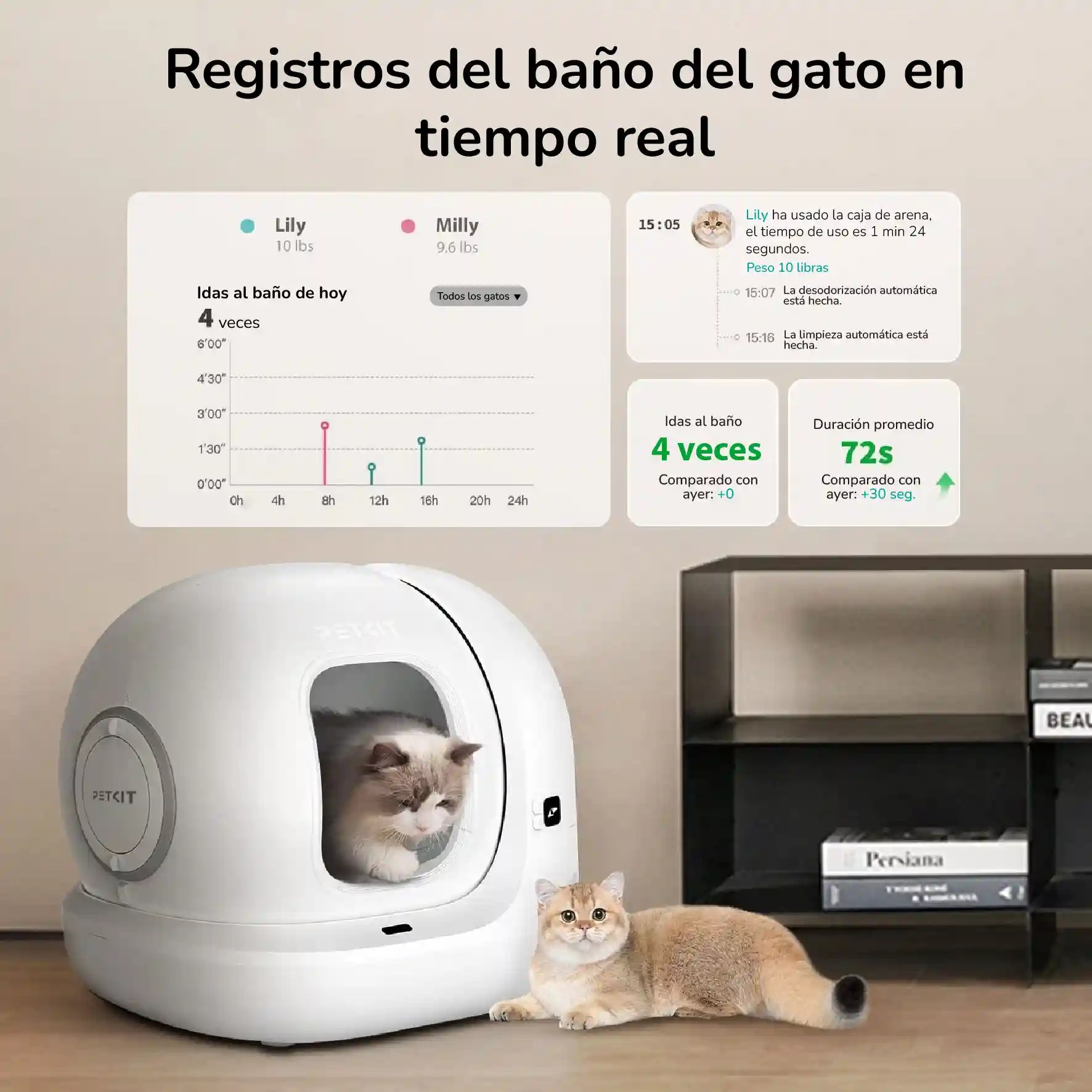 - 📲 Control total desde tu smartphone: Con la app de PETKIT, monitorea la frecuencia de uso, el peso de tu gato y controla los modos de limpieza. Todo, sin moverte del sofá.