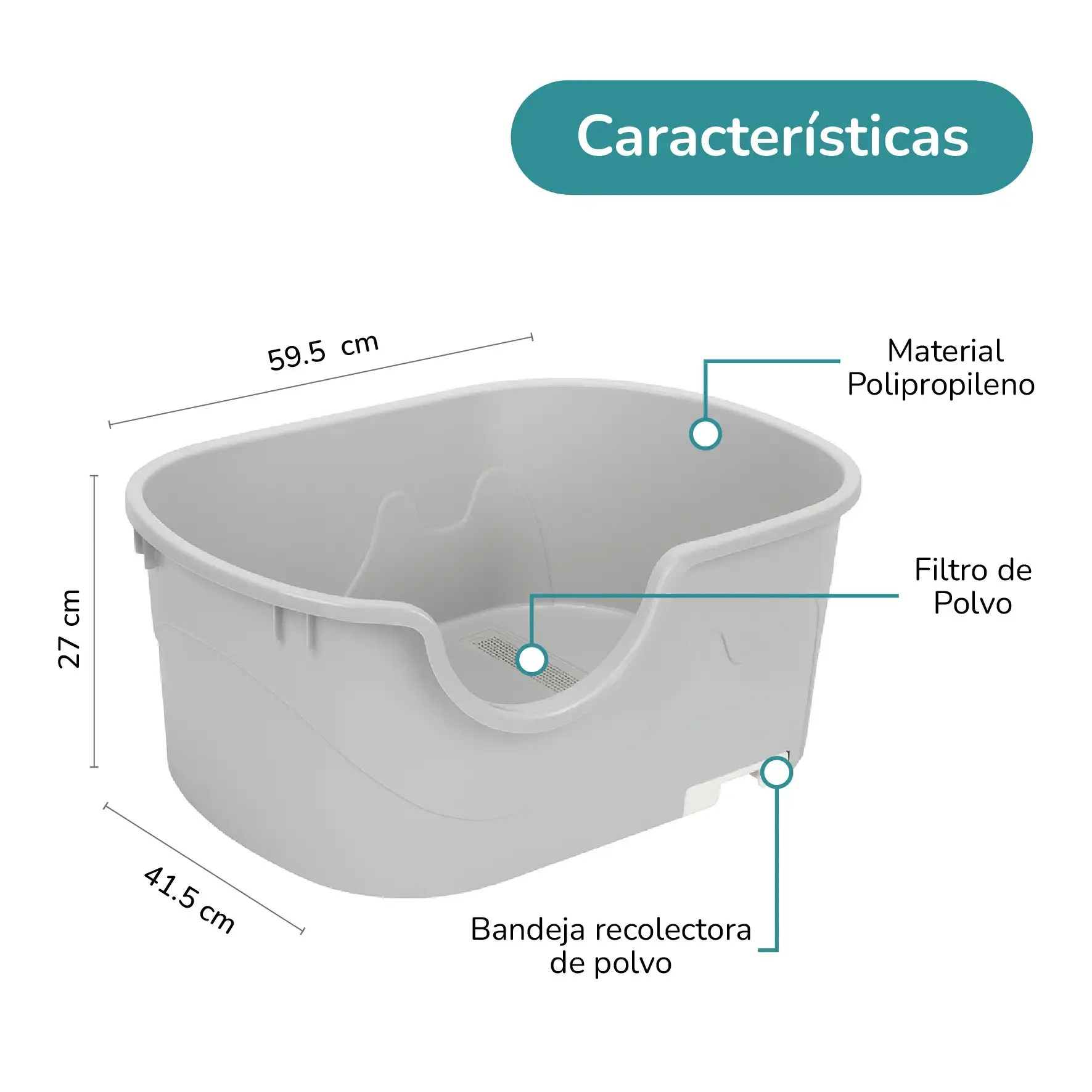 Este arenero gris combina tamaño, funcionalidad y un diseño práctico que mejora la experiencia tanto de tu gato como la tuya. Su filtro antipolvo contribuye a cuidar la salud respiratoria de tu mascota, mientras que su estructura robusta y las paredes elevadas ayudan a mantener el entorno limpio. Una solución práctica para quienes buscan higiene y confort en un solo producto.