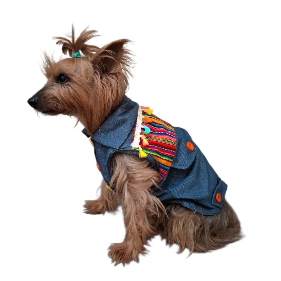 Confeccionado en una base de tela tipo denim suave y resistente, este abrigo cuenta con un tejido superior multicolor típico de los Andes, detalles de botones naranjas decorativos y aplicaciones bordadas. Es perfecto para paseos urbanos o rurales donde tu perro necesita abrigarse con estilo sin perder movilidad.