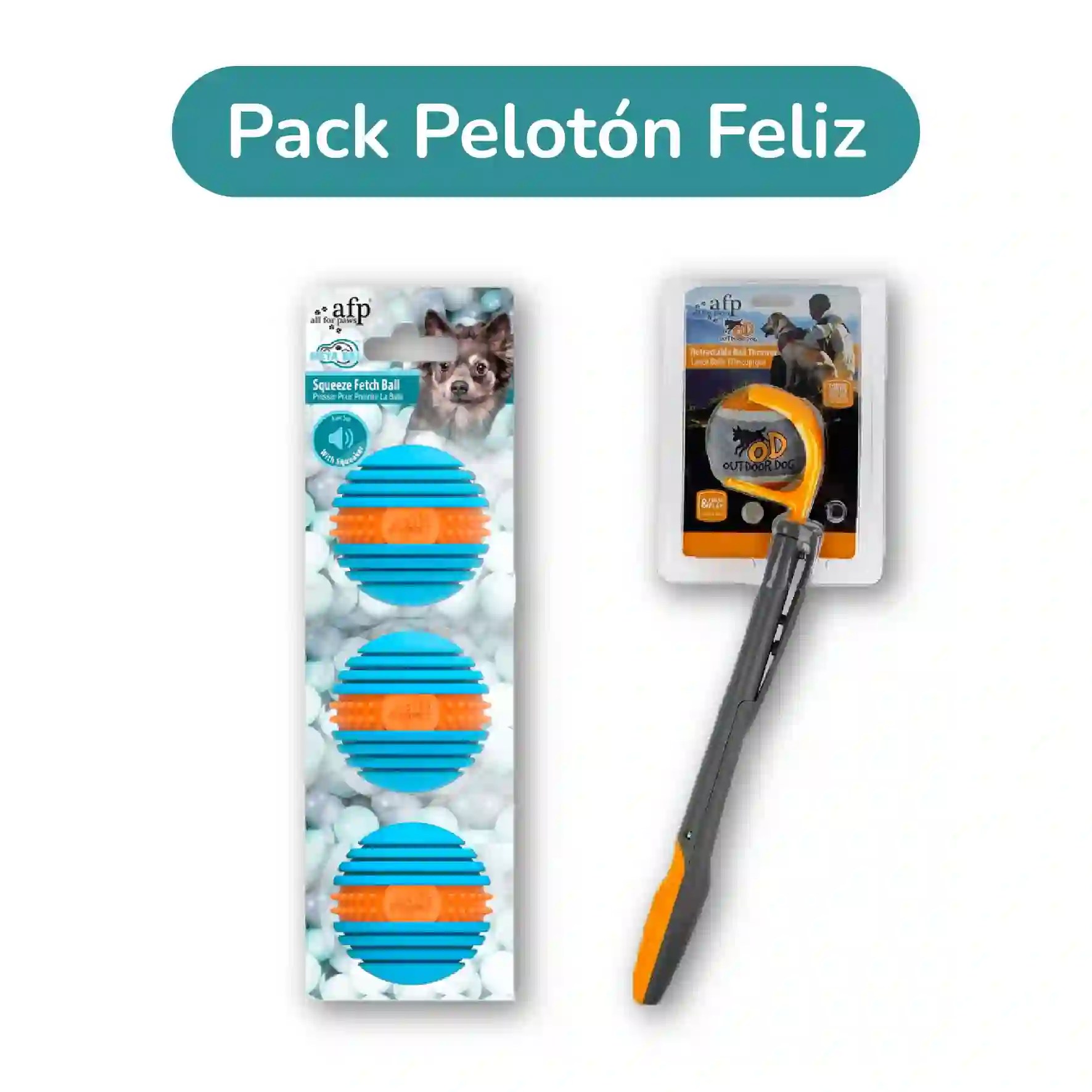 El Pack Pelotón Feliz combina juego y salud en un solo set. Incluye un lanzador de pelotas manual para divertidos juegos al aire libre y un pack de pelotas dentales que ayudan a mantener los dientes de tu perro limpios y fuertes mientras juega.